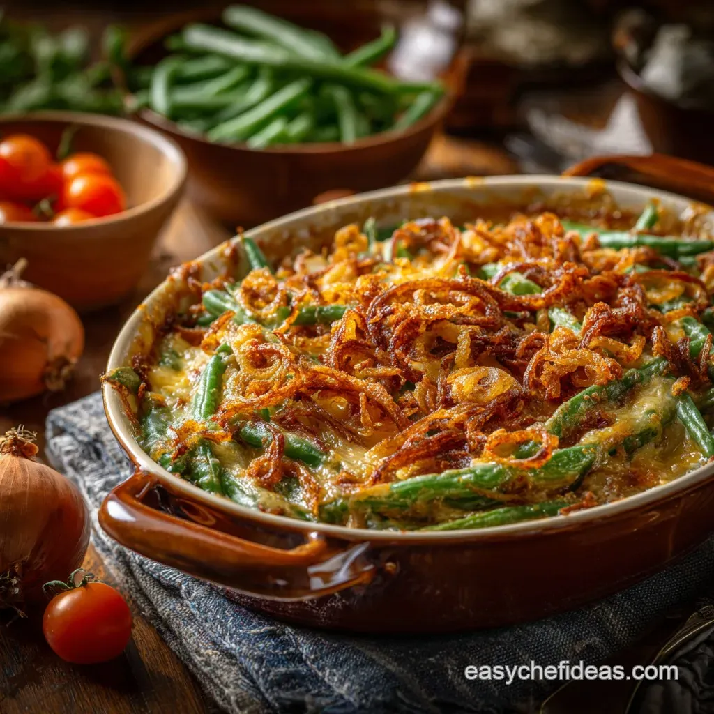 Leftovers of the baked Green Bean Casserole Easy should be cooled quickly after serving and stored airtight in the refrigerator for up to three days. To reheat, cover the dish loosely with foil and bake at 175°C (350°F) until warmed through completely, then always add a fresh layer of crispy topping before serving.