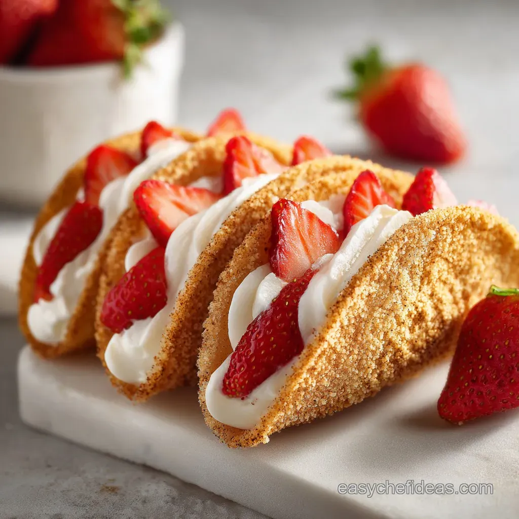 To make these look truly professional, I suggest placing them in a dedicated taco rack on a white ceramic platter. The white background makes the red strawberries scream. Add a few mint leaves around the base of the tacos for a pop of green, which complements the red perfectly.