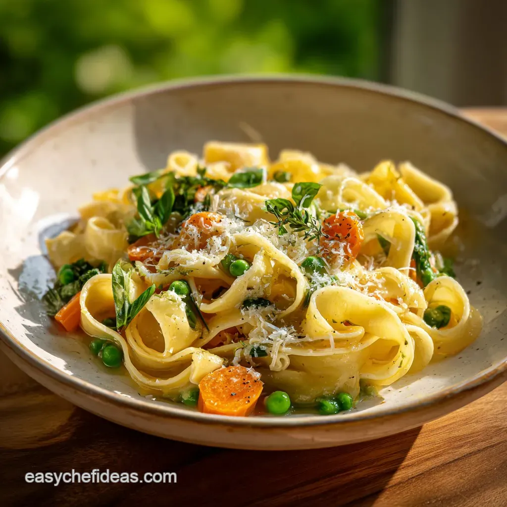 Typically, spring vegetables like carrots, broccoli, zucchini, and peas. The defining feature is the light, creamy sauce made from heavy cream, Parmesan cheese, lemon zest, and fresh herbs.