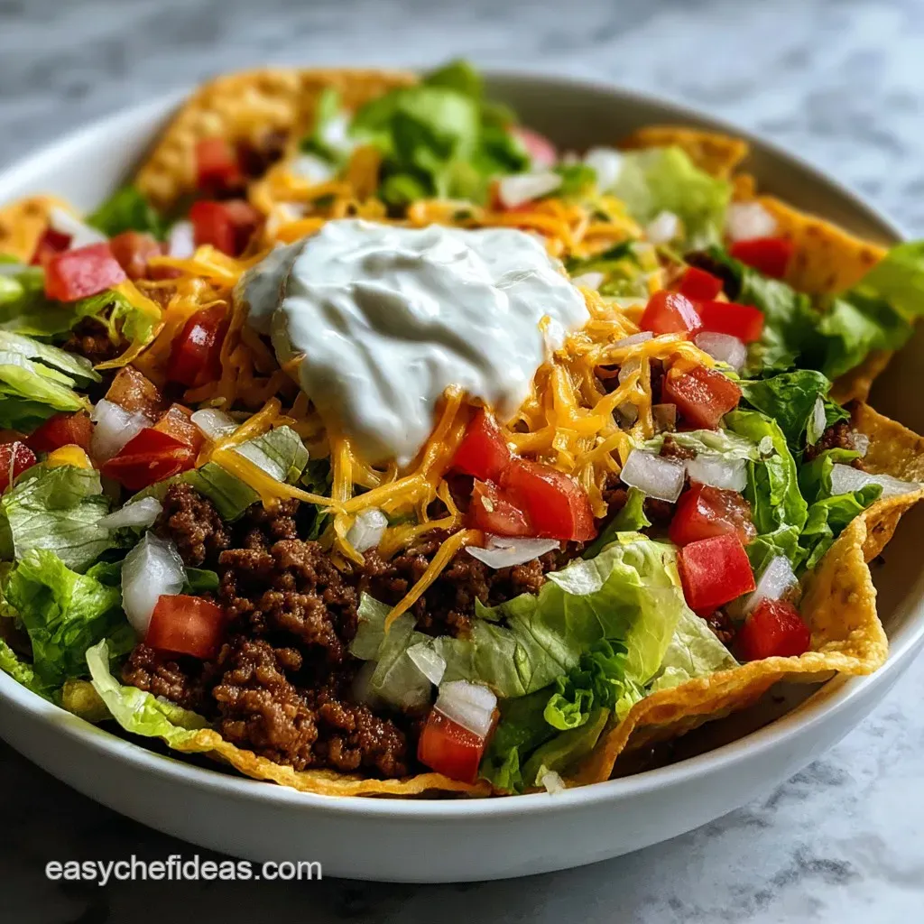 To make a healthy Taco Bell Taco Salad, skip the frying. You can drape the tortillas over an oven safe bowl and bake them at 375°F for 10 minutes until crisp. Use ground turkey instead of beef and swap the sour cream for non fat Greek yogurt.