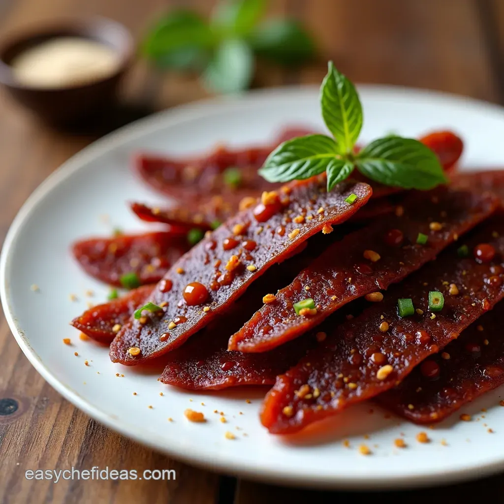 Think beyond the bag! For plating, arrange your homemade beef jerky attractively on a wooden board. Garnish with sesame seeds. A small bowl of kimchi works wonders too.
